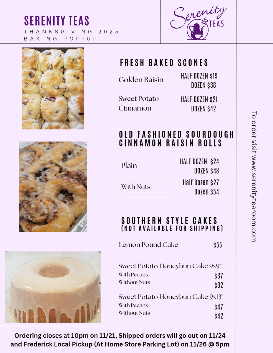 Shipped orders will go out on 11/24 and Local Frederick Pickup at the At Home Store Parking Lot will be on 11/26 from 5-5:30pm.